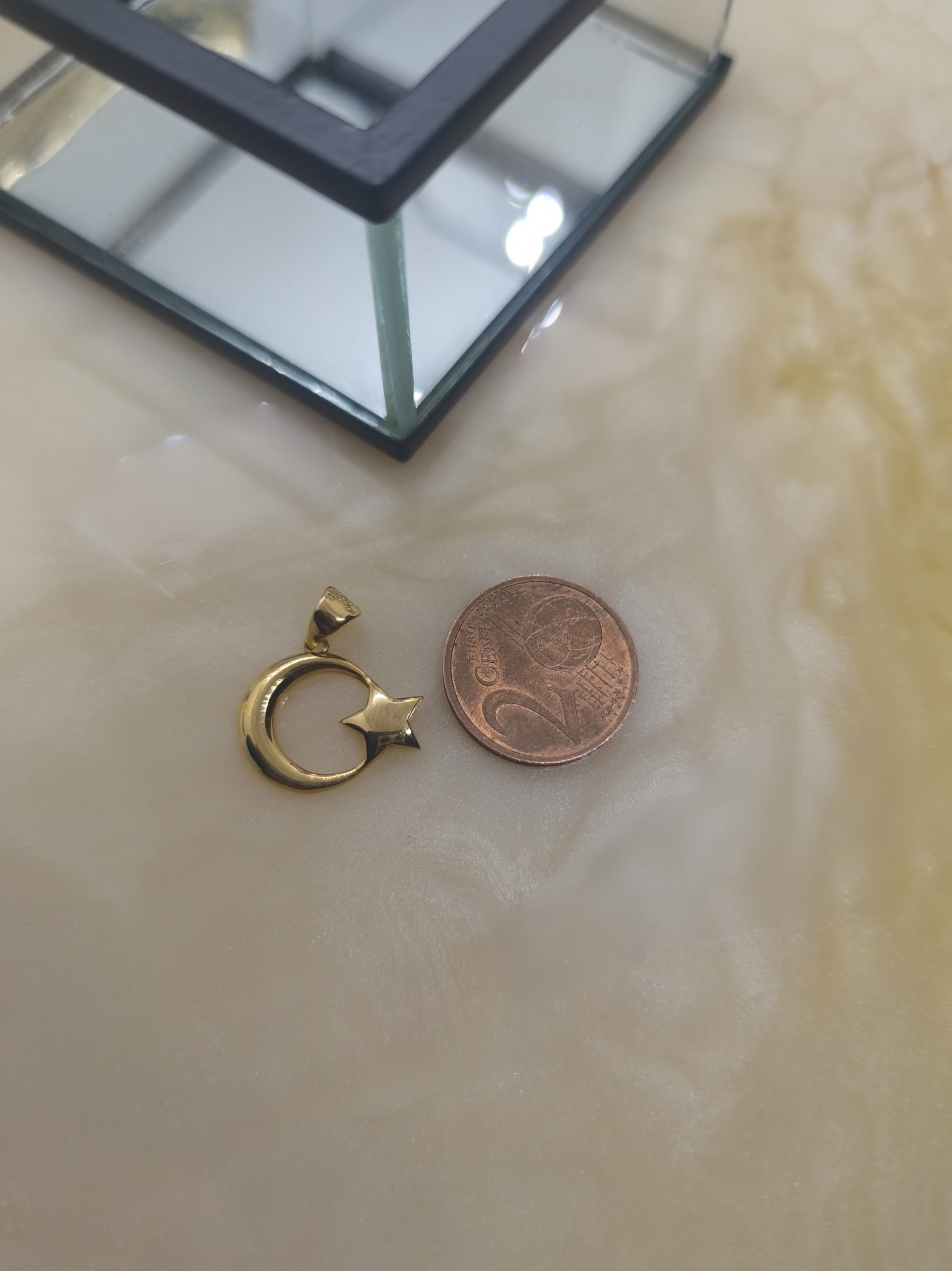 Dieser elegante Anhänger ist ein hochwertiges Schmuckstück aus reinem Gold und besticht durch das ikonische Motiv des Halbmonds und Sterns.