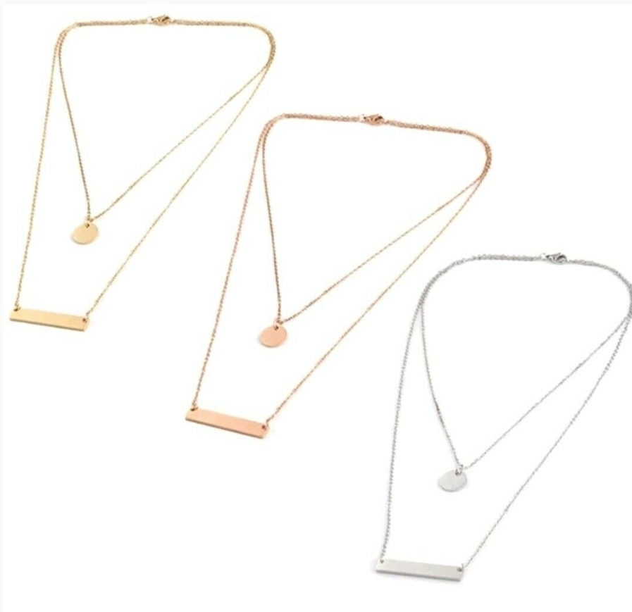 Modeschmuck Double Layer Gold Personalisierte Edelstahl Blank Bar Disc Charm Halskette